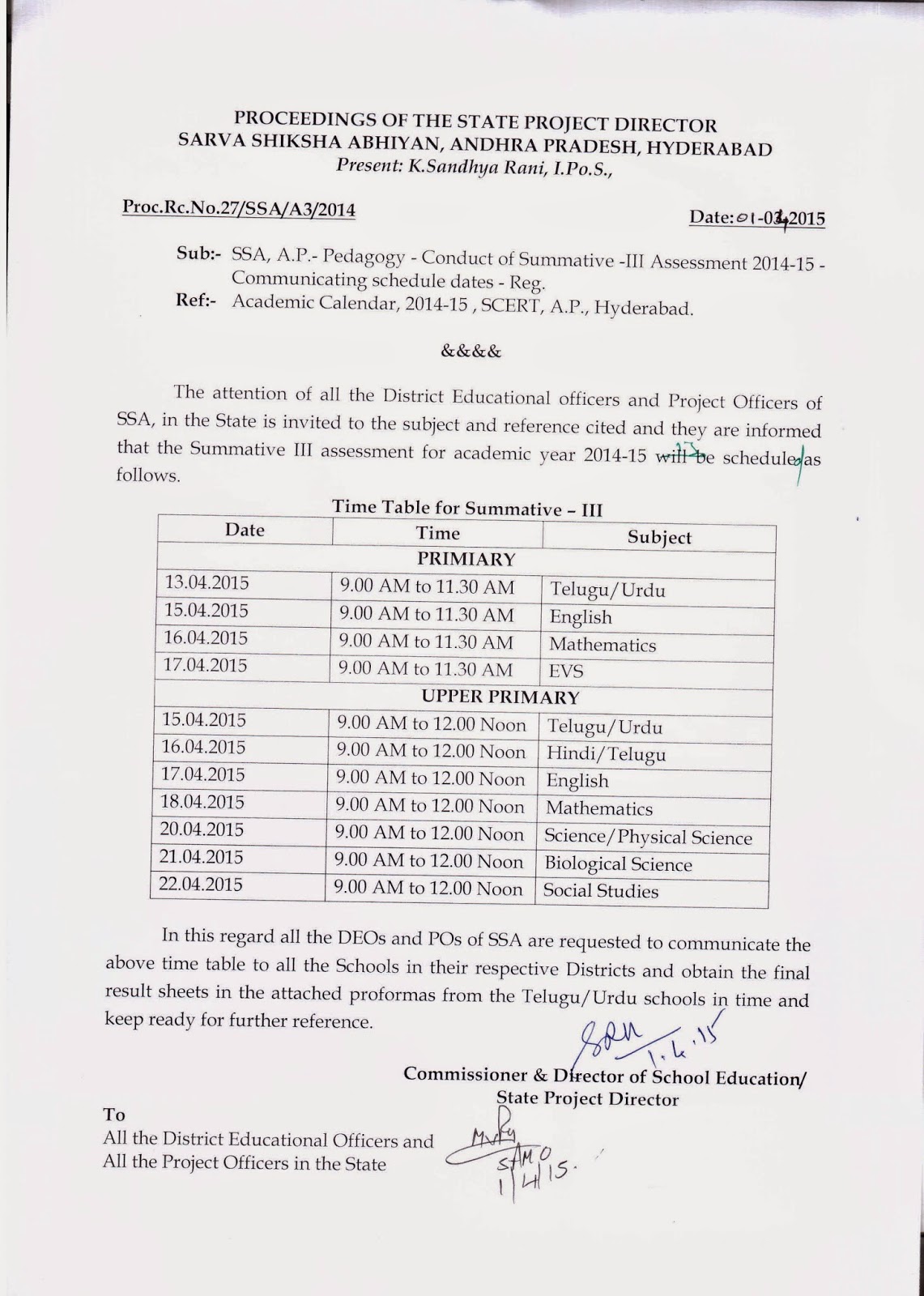 The attention of all the District Educational officers and Project Officers of SSA, in the State is invited to the subject and reference cited and they are informed that the Summative III assessment for academic year 2014-15 the schedule as follows.